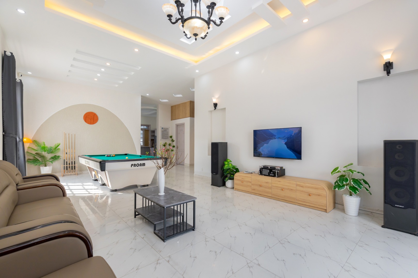 • Phòng sinh hoạt chung có ghế sofa, bàn ghế uống café, tivi đầy đủ